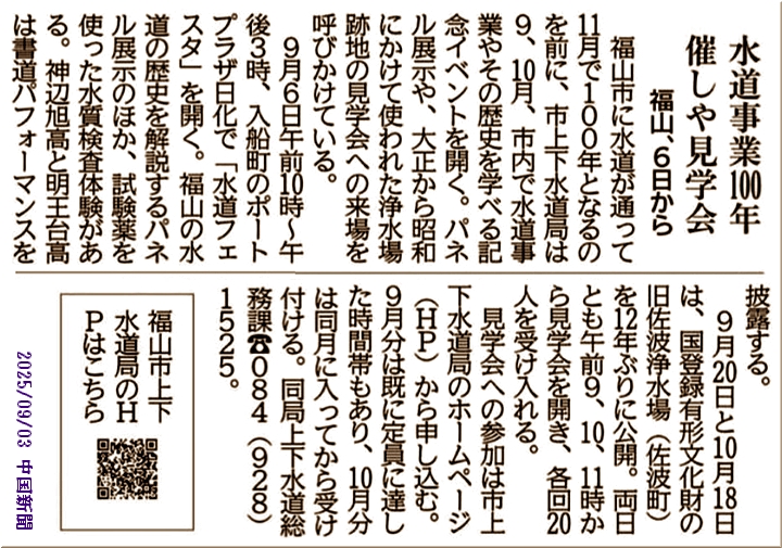 今朝の中後新聞朝刊紙上に「国登録有形文化財の旧佐波浄水場を12年振りに公開」の記事掲載が(^.-)☆