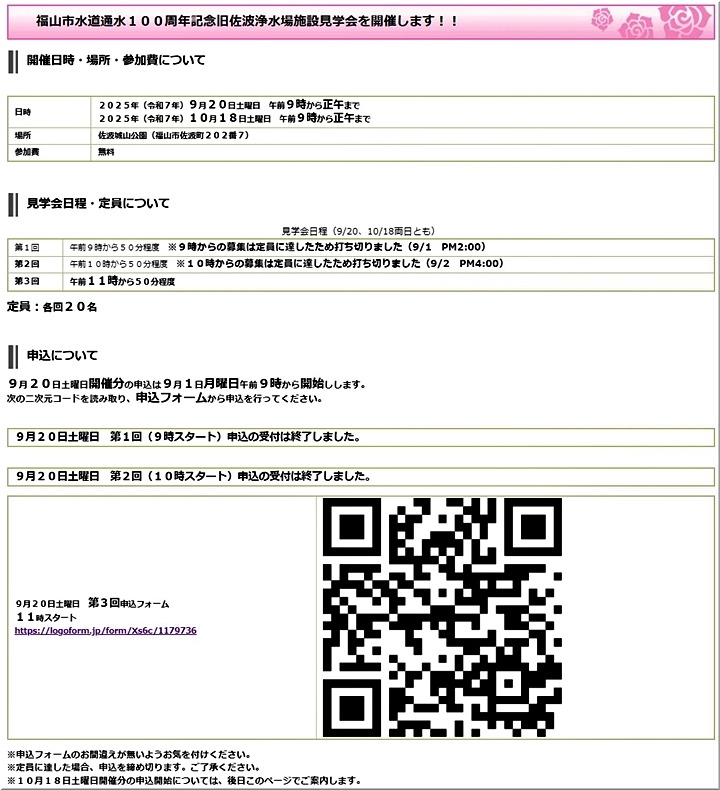 …との事で、見学会開催日は、9/20(土)と10/18(土)の2日間。いすれも、A.M.9:00・10:00・11:00の3回開催で、申し込みは市上下水道局のHPから。