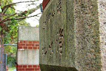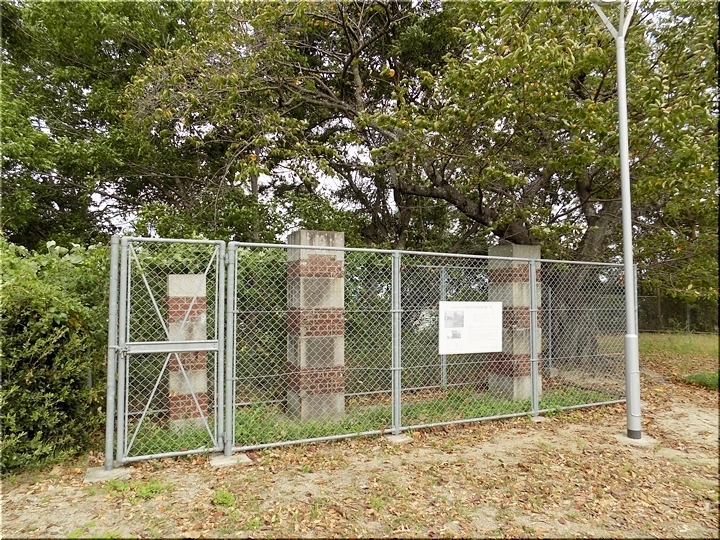 旧佐波浄水場は、かつて浄水場の正門として1925年(大正14年)9月に建造されました。現在は、主門の門柱(2本)及び通用門の門柱(1本)が残るのみであり、当時の扉はありません。主門にあたる一対の門柱は、0.6m角、高さ2.4m、通用門の門柱は、0.4m角、高さ1.8mあり、煉瓦と石を交互に積み重ね、縞状の外観を呈しています。また、真中の門柱は「福山市水道浄水池」と彫り込まれています。石と煉瓦張り部分を繰り返すデザインは、大正時代の浄水場の建造物に調和したものとなっています。