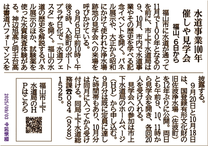 9/20(土)に水道事業100年°L念イベントで、12年振りに佐波浄水場を公開ですか…