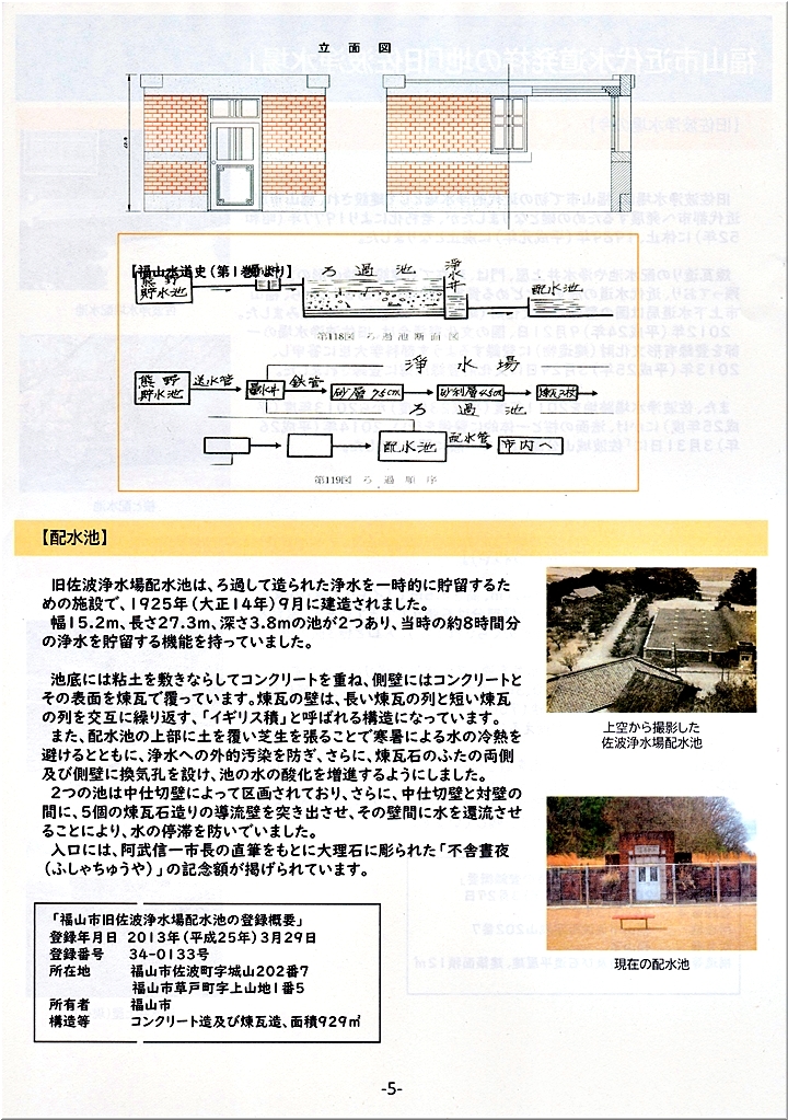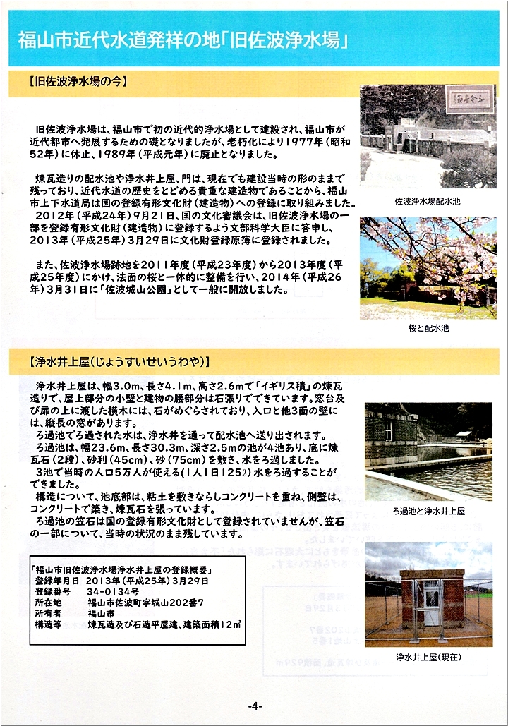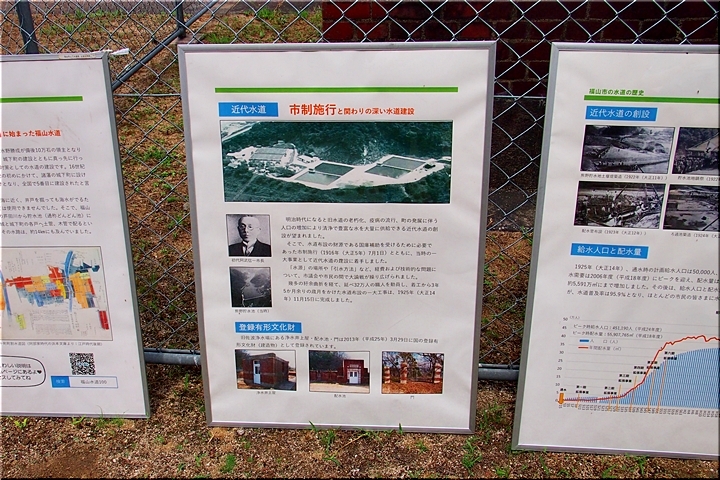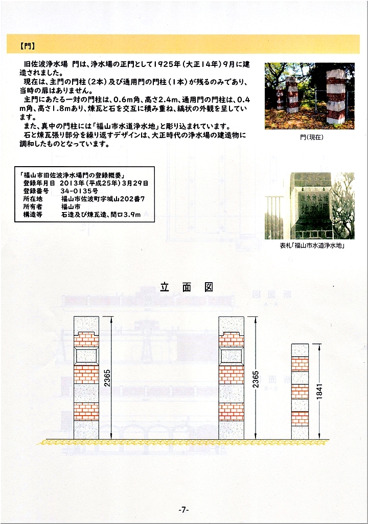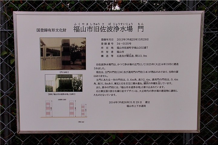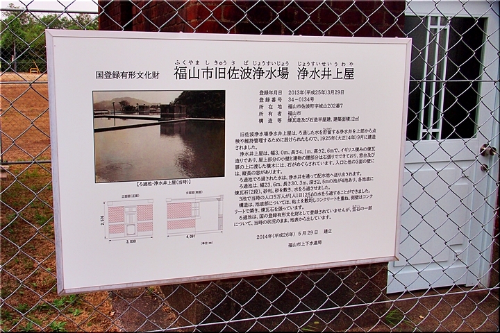 ?現在、旧佐波浄水場は福山市における近代水道発祥の地として、煉瓦造りの配水池や浄水井上屋(じょうすいせいうわや)、門は、現在でも建設当時の形のままで残っており、近代水道の歴史をとどめる貴重な建造物であることから、国の登録有形文化財(建造物)に登録されています。