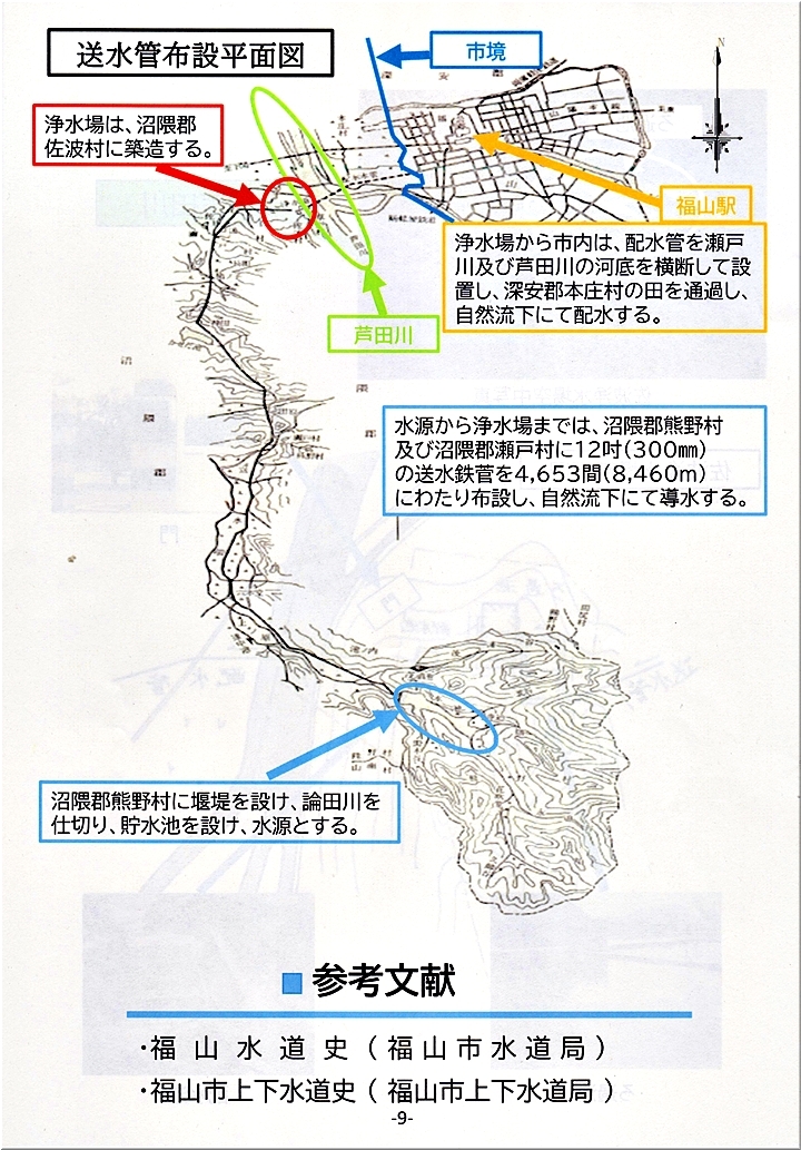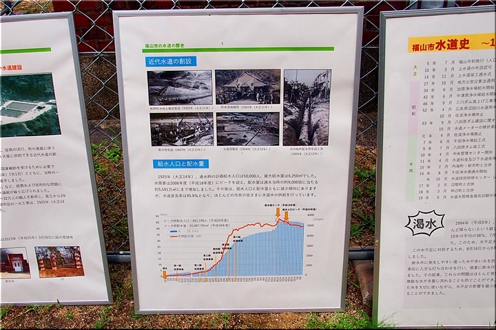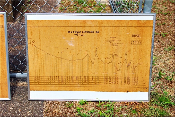 熊野町渓谷に築造した貯水池を水源として、自然流下により佐波町城山の浄水場から旧福山市へ給水するもので、1925年(大正14年)11月15日に通水開始し、福山市が近代都市へ発展するための礎となりましたが、老朽化により1977年(昭和52年)に休止、1989年(平成元年)に廃止となりました。