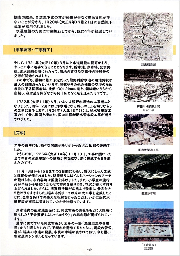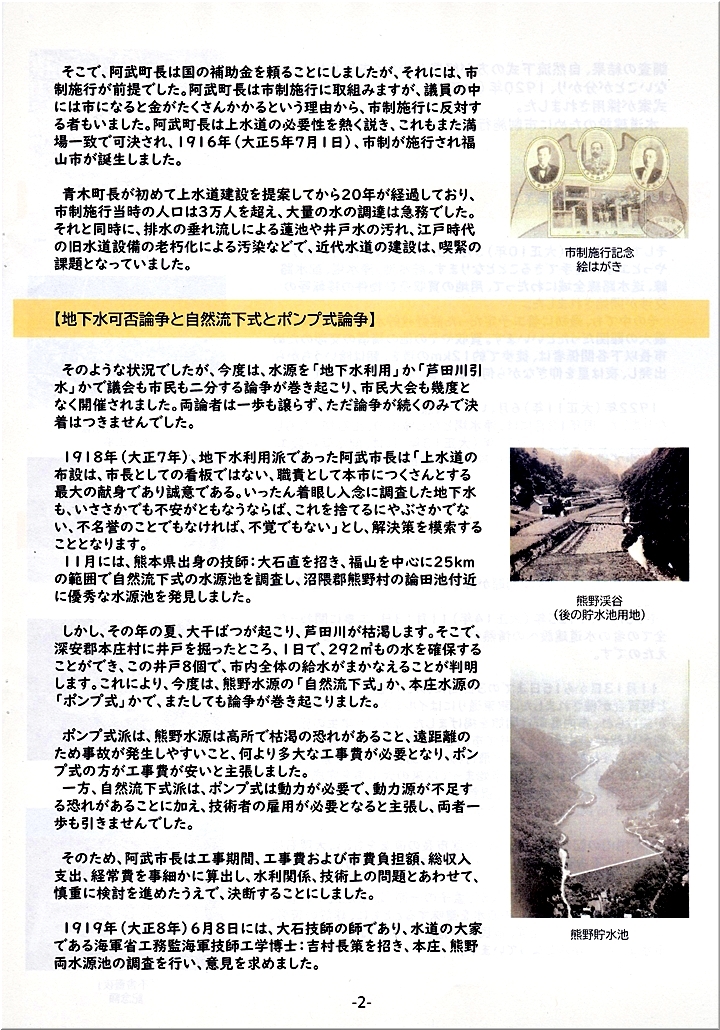 熊野町渓谷に築造した貯水池を水源として、自然流下により佐波町城山の浄水場から旧福山市へ給水するもので、1925年(大正14年)11月に竣工通水式を行いました。