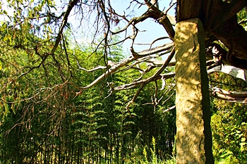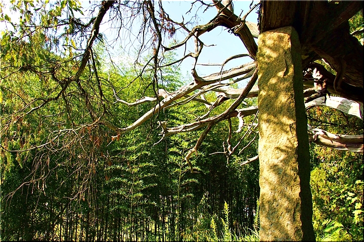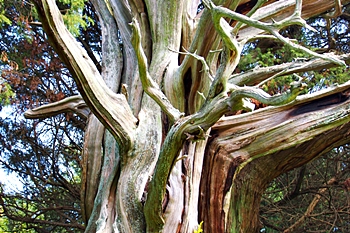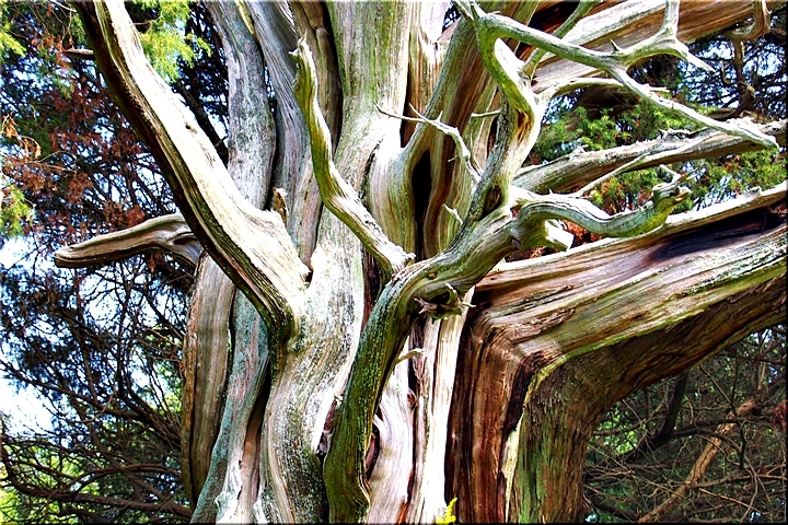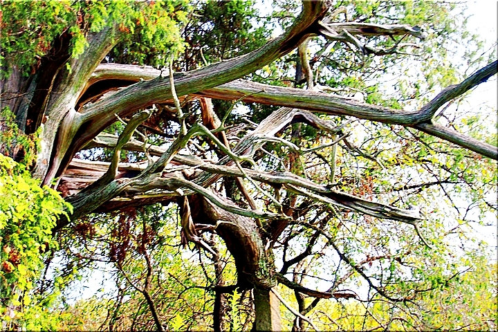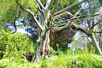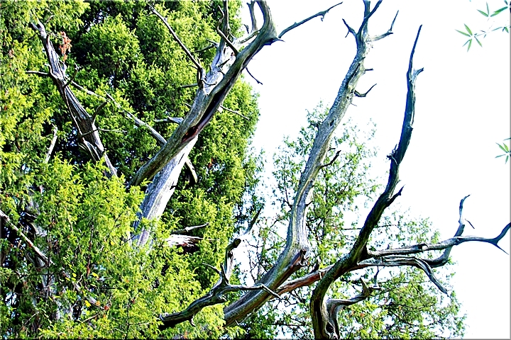 遠くから眺めた姿は、主幹が枯れて葉は付いていないので、白骨化した枝が剥き出しになっています。その白骨化した枝は四方に広がり、不思議な力強さを感じることができます。近くに寄ってみると、主幹の樹皮は枯れ落ちて、剥き出しの白い肌が光っており、側枝の生きている部分との対比を楽しむことができます。