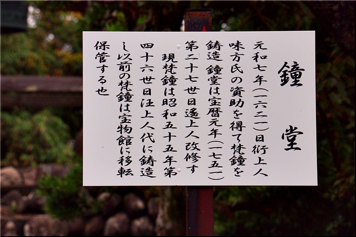 元和七年、日衍上人・味方氏の資助を得て、梵鐘を鋳造せる。