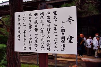 寛文十二年、当山二十世日行上人の代に創建されました。棟札には明治三十八年日静上人瓦葺に、とあります。