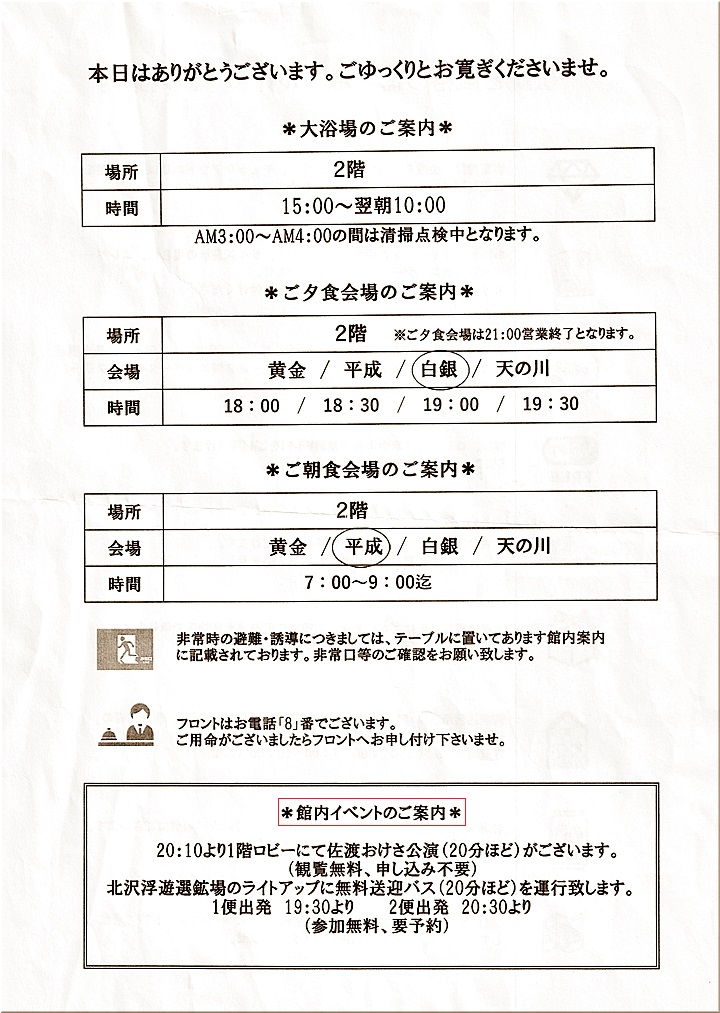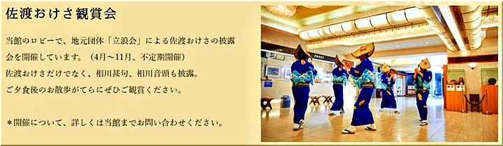 ホテル万長《anの館内イベントとしましては、ホテル1階ロビーで「佐渡おけさ公演」と、無料送迎バスによる「北沢浮遊選鉱場のライトアップ見物」が有りますようです。
