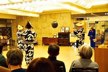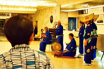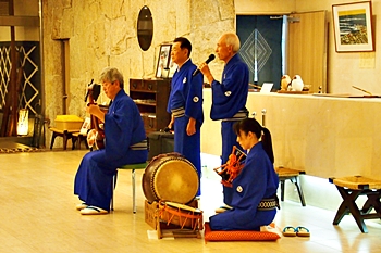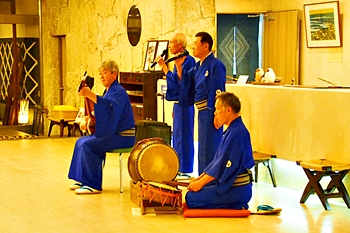 当館のロビーで、地元団体「立浪会」による佐渡おけさの披露会を開催しています。(4月〜11月、不定期開催)
