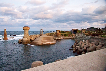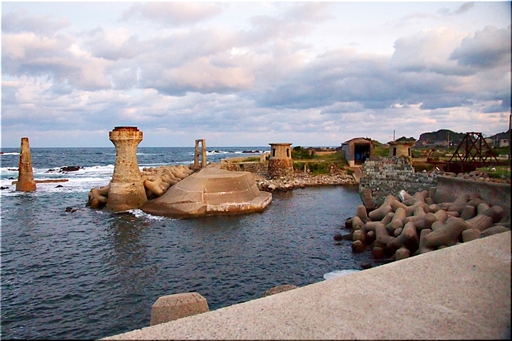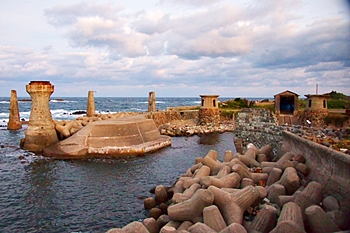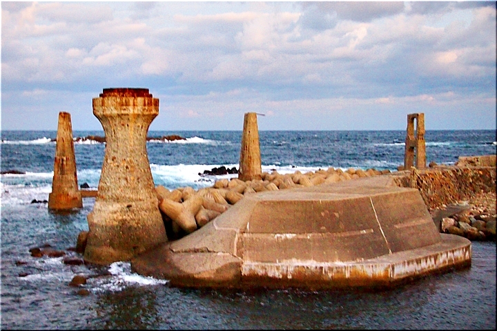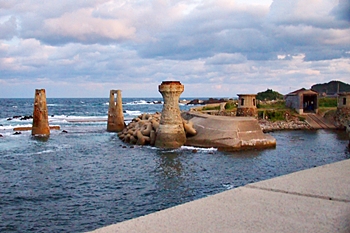 大間港は佐渡鉱山の鉱石や石炭などの資材の搬出入を目的として明治時代中期に築港され、佐渡金銀山の発展を支えました。コンクリート工法の普及以前に用いられていた「たたき工法」を使ったカラフル護岸や、にょっきり生えた橋脚や台座跡等の構造物が残存しています。