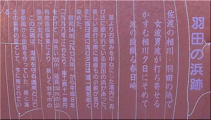是より石積みを中心にした湾内に、おけさに歌われている羽田の浜があった。美しい波打ち際に幾艘もの小船が並び、また春日崎に沈む夕日は湾一面を赤く染めた。