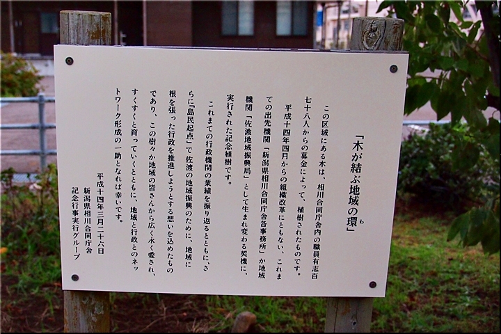 この区域にある木は、相川合同庁舎内の職員有志百七十八人からの募金によって、植樹されたものです。