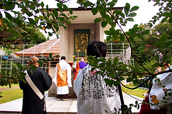 鈴木日教貫首からご挨拶と、妙照寺≠フ沿革・近況等のお話しがありましてから、曼荼羅奉掲塔≠フ前で御開帳です。
