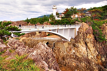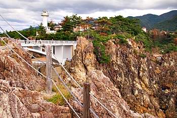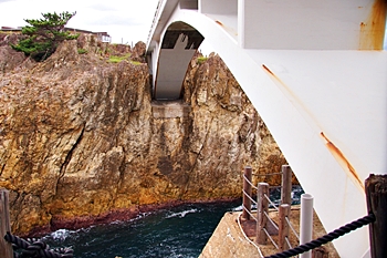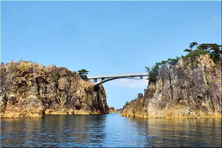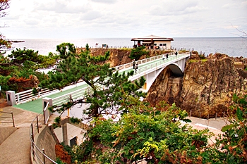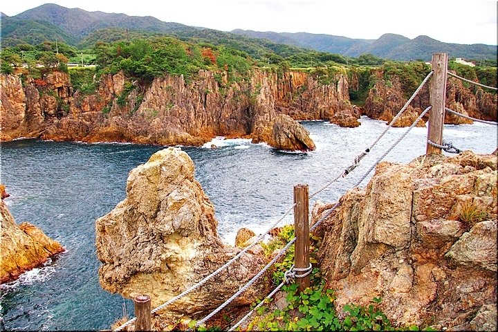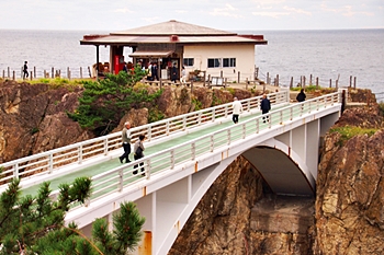 橋名は、遊仙橋(ゆうせんきょう)ですが、「まちこ橋」とも呼ばれ、松竹映画「君の名は」のロケで吊り橋のシーンが有名になりました。今は頑丈なコンクリート製の橋に架け替えられています。橋を渡った島を揚島(あげしま)といい「あげしま展望台」となっています。5月下旬から6月中旬頃には岩ユリやハマナスの花が岩場に咲きます。