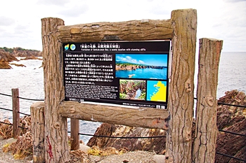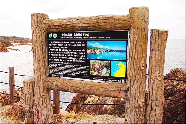 名勝地「尖閣湾」は第1景から第5景の「5つの峡湾」のことをいいます。高さ約20m、長さ約4kmに及ぶ断崖絶壁です。(看板の左に見える景色)