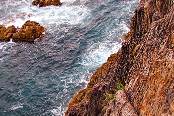 尖閣湾は冬の猛烈な季節風と荒波によって作られた海食崖ですが、もう一つ大きな要因があります。それは尖閣湾の断崖がしま模様の目立つ流紋岩でできているためです。この岩石は、しま模様に沿って剥がれやすい性質があります。尖閣湾の流紋岩はしま模様が縦方向に伸びているため、切り立った風景となりました。