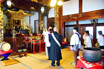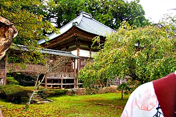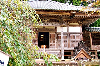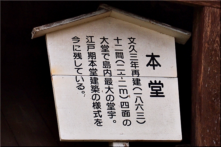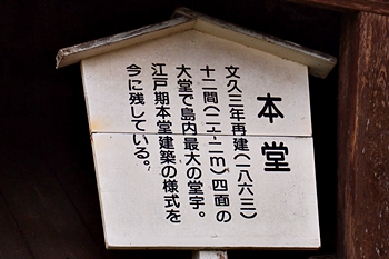 文久3年再建(1863)十二間(22m)四面の大堂で島内最大の堂宇。江戸期本堂建築の様式を今に残している。