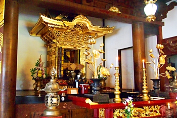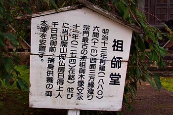 明治13年再建(1880)六間(11m)四面三方縁造り宗門最古の宗祖御木像(文永11年(1274)在銘)並びに当山開山阿仏坊日得上人、千日尼御前、捨身供養の御木像を安置す。