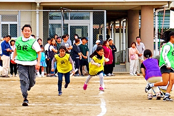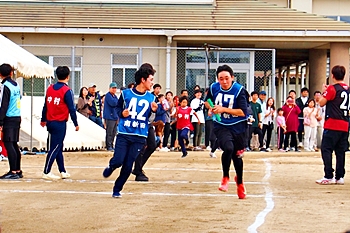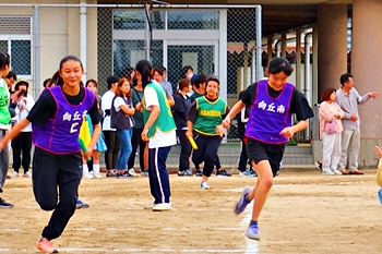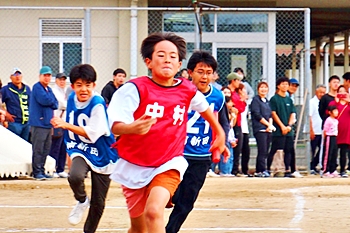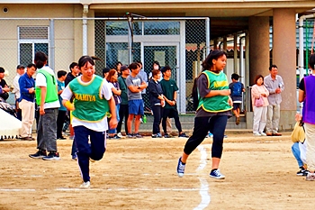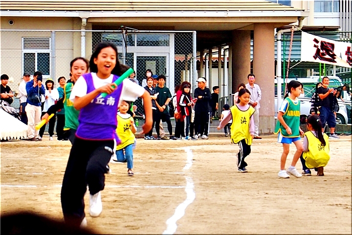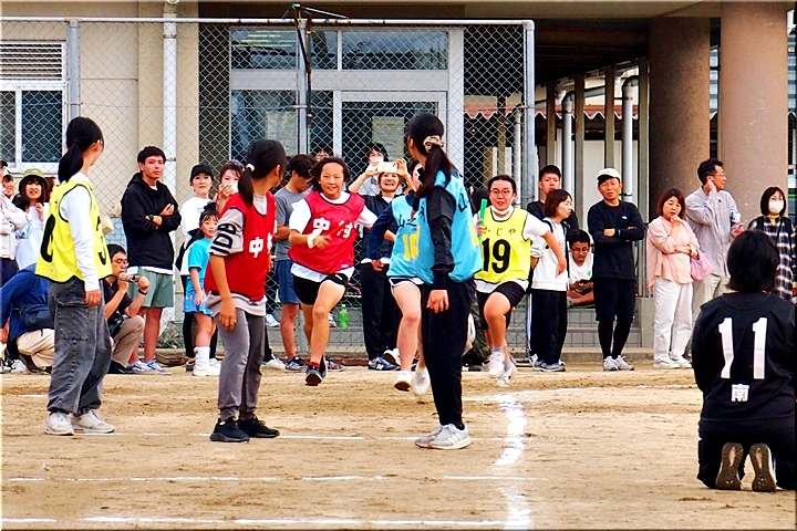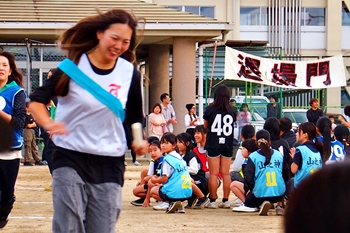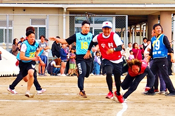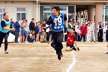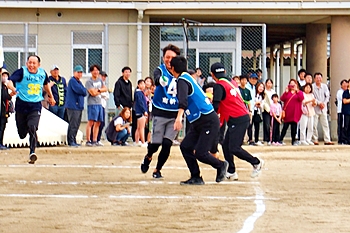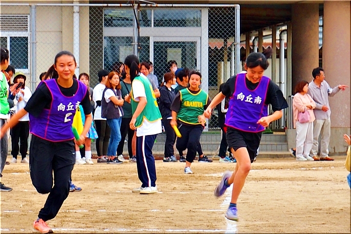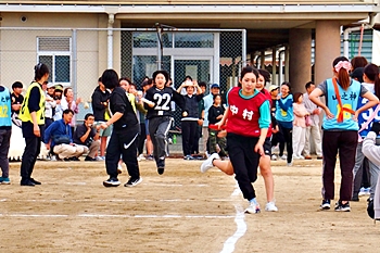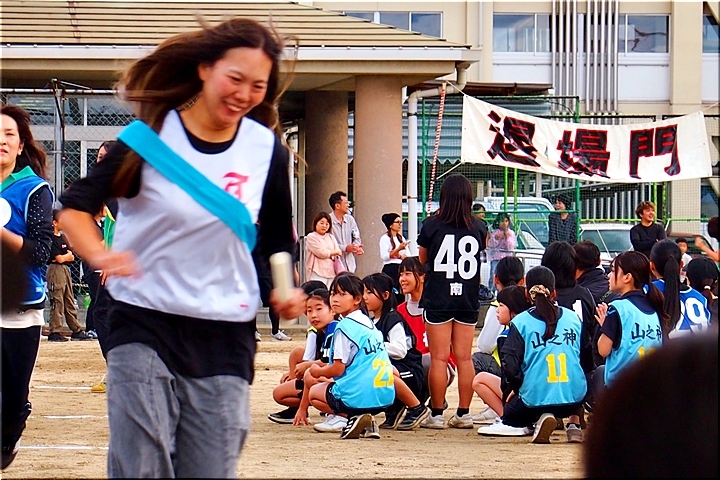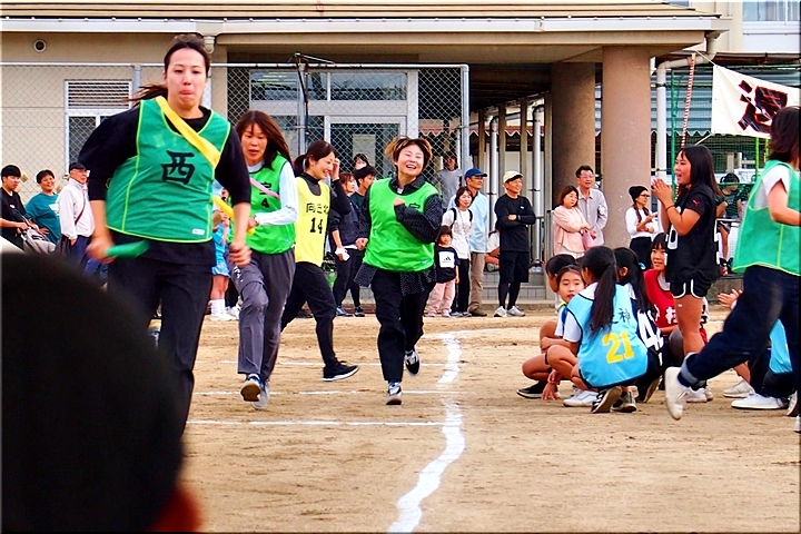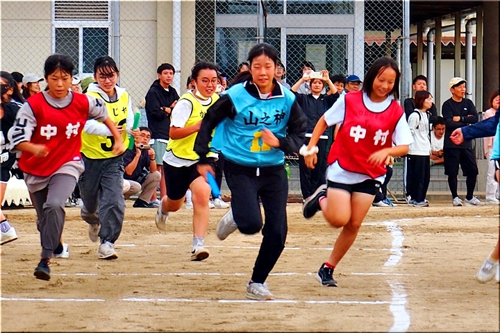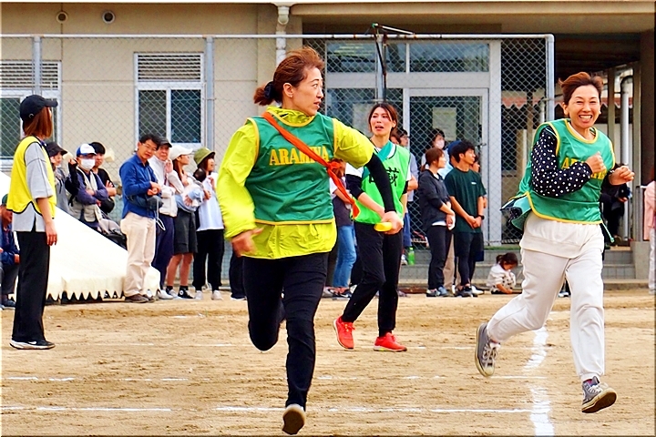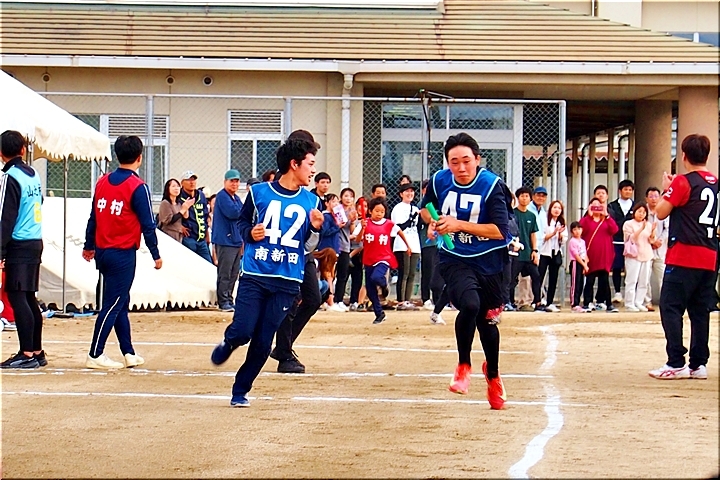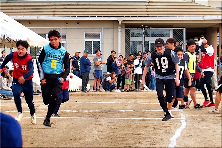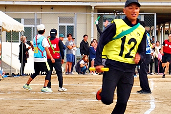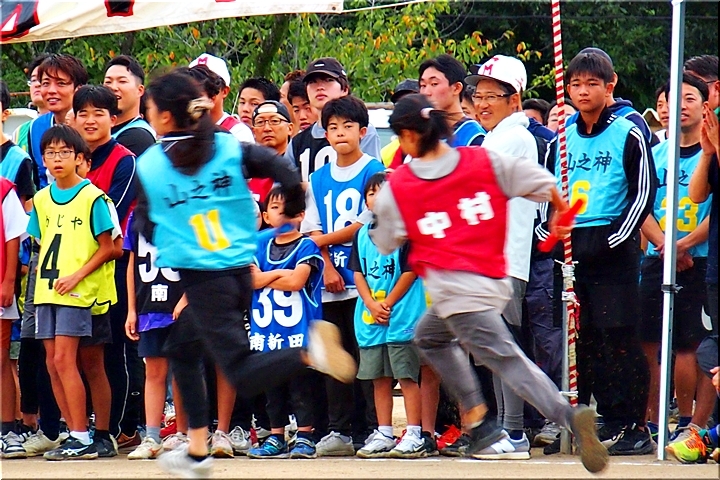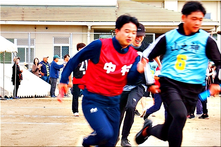 最終種目ですから、どのチームも応援に力が入ります。年齢別リレー≠ヘ、先に女子で、続いて男子。中村チームの女子、バトンの受け渡しも実にスムーズで、このまま何にもトラブルが起きませんと、トップでのゴールが濃厚ですネ(^-^)//"