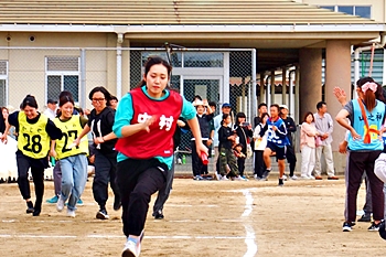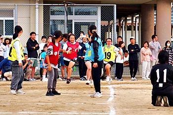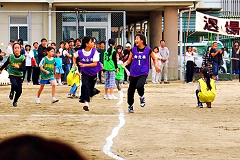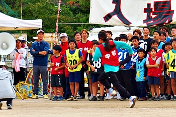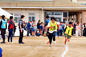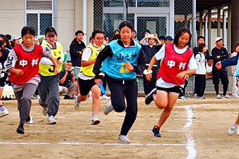 年齢別リレー≠フ女子の部は、どぅにかトップでゴールしました中村チーム。続いて、男子の部のスタートです。
