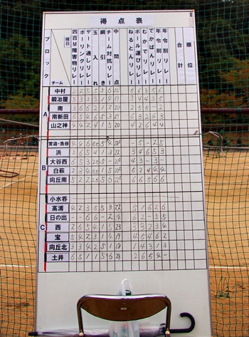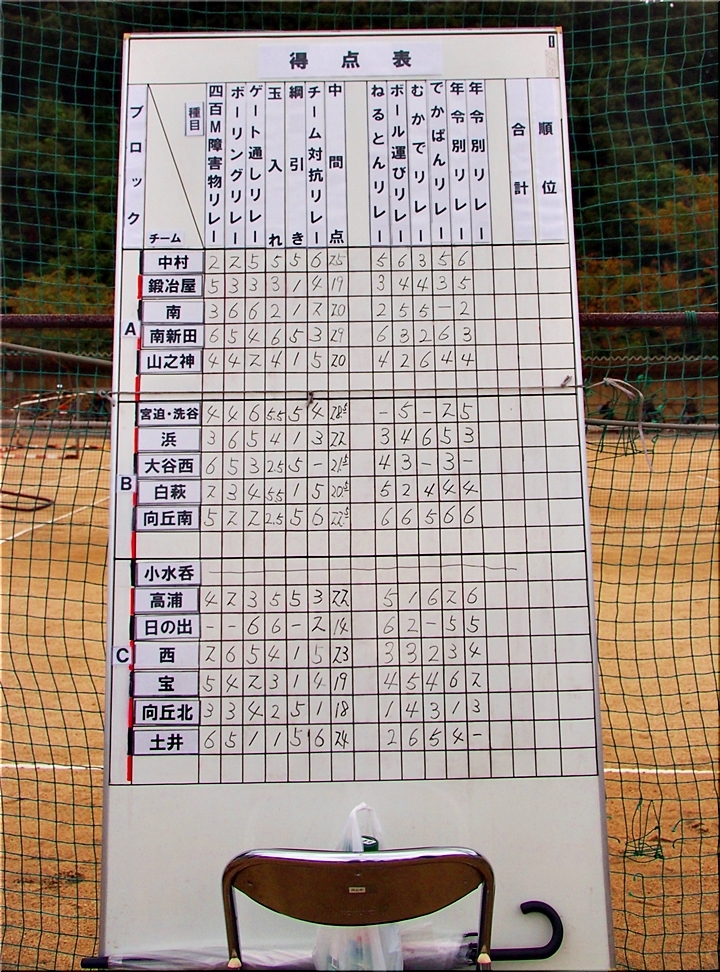 年齢別リレー(女子)≠ワでの点数は記載されていますから、ササッとAブロックチームの集計をしてみますと、中村--50∞鍛冶屋--38∞南--34∞南新田--49∞山之神--40≠ニ、なりますネ。
