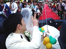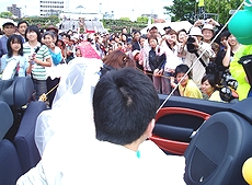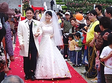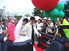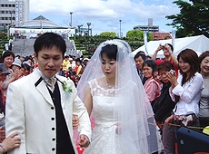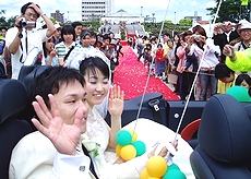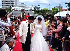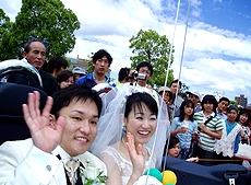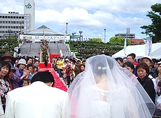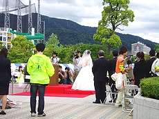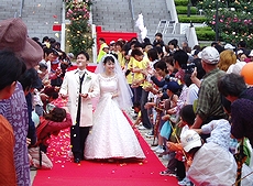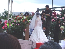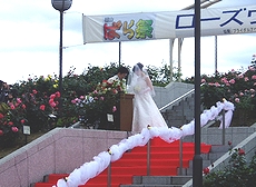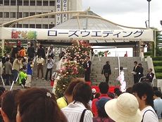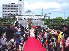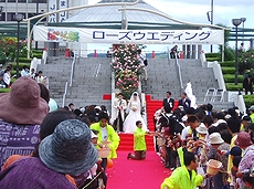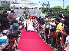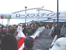 開幕のセレモニーは、恒例のローズウエディングで締めくくり。公募で選ばれた同市神辺町、会社員森田玄さん(28)と典子さん(26)が、百九十種五千本のバラが咲き誇る公園のばら花壇を舞台に永遠の愛を誓った。二人が指輪を交換し、口づけを交わすと、見守っていた来場者が盛大な祝福の拍手を送った。