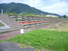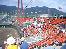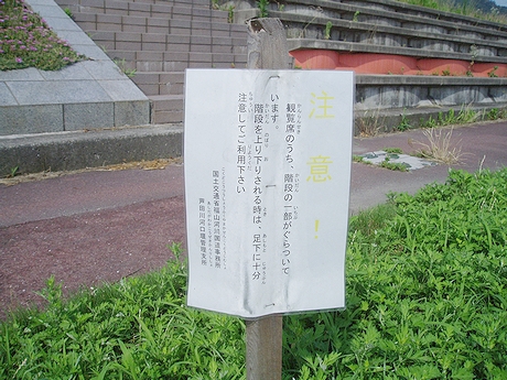 「観覧席のうち、階段の一部がぐらついています。階段を上り下りされる時は、足下に充分注意してご利用下さい」