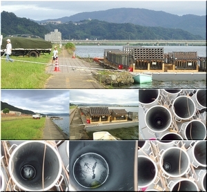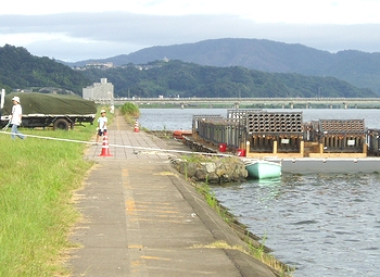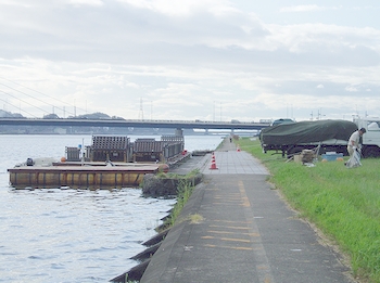 眼下を見下ろしますと、朝のうちにゴミ拾いしました河川敷では台船の撤去作業が進行中でありました。