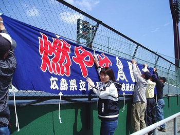 (左)向原高校保護者会の方々が、横断幕の貼り付け作業中です(^.-)☆