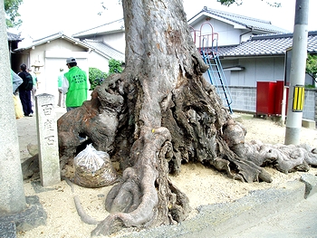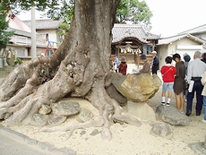 下の森には鳥居の横には樹齢400年と言われる椋の大木がある。また、百度石があるが、この百度石の石柱は病気平癒等を祈願するためにその石柱から神社に百回往復して願い事を成就するために造られたものである。