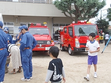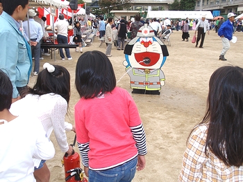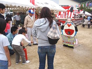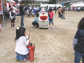 チビッ子の皆さんに消化器に馴染んで頂こう…との想いで企画されたのかどぅかは知りませんけど、ドラエモン目掛けて消化器を放水。