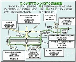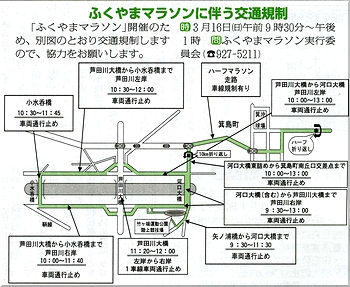 ところで、毎月月初の1日には新聞の折り込みチラシと共に市の広報『ふくやま』が入りますけど、今朝の朝食時にパラパラッとめくっておりますと、3/16(日)の「ふくやまマラソン」の交通規制が載っておりました。