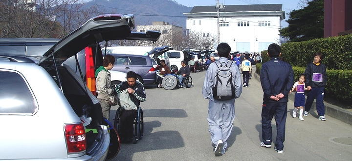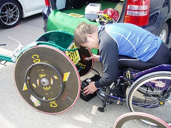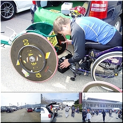 競技場に近付いて来ますと、競技用車椅子の部に出られます選手の方々が入念にマシンの点検中でありました。