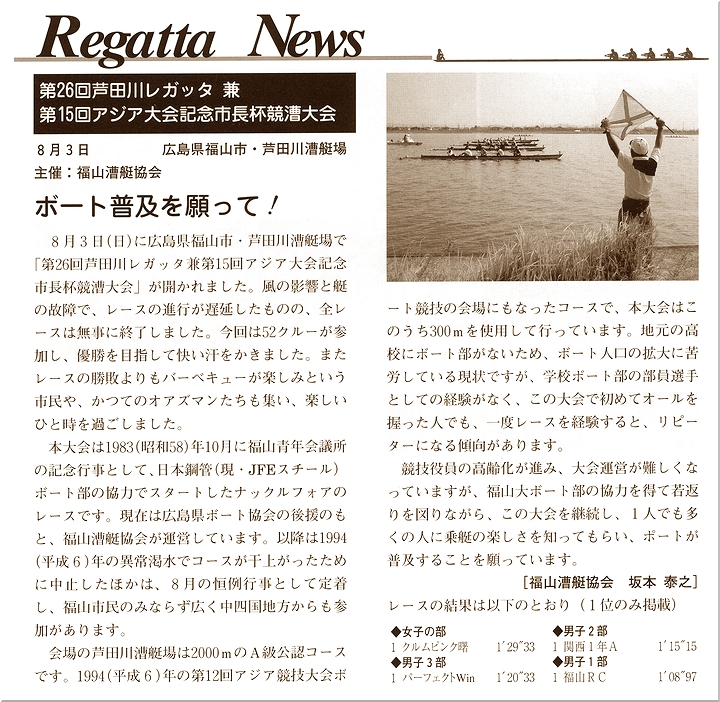 初めまして。社団法人日本ボート協会発行の「月刊ローイング」の編集部でございます。実は弊誌で「第26回芦田川レガッタ(福山漕艇協会寄稿)」を掲載する予定です。しかし写真がございませんでした。