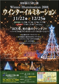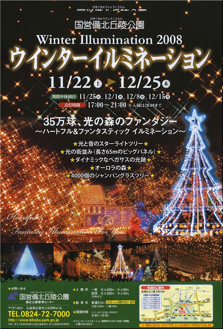 国営備北丘陵公園では、平成20年11月22日(土)より12月25日(木)まで35万球のイルミネーションで園内を装飾する『ウインターイルミネーション2008』を開催します。