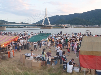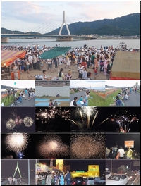 午後7時半、点火式でスタート。芦田川大橋の上流約400メートルの地点から、昨年より1,000発多い1万4,000発を打ち上げた。赤、緑、黄金色などの大輪が夜空を焦がし、水面を染めると、集まった家族連れやカップルたちは歓声を上げていた。