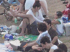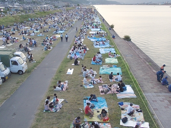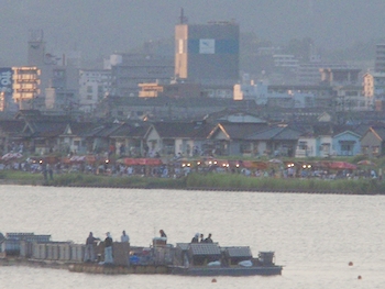 河川敷の花火客を眺めながら、丁度、花火打ち上げの台船の正面の土手にと到着。