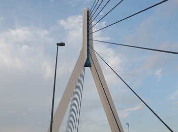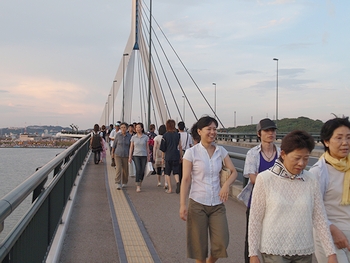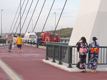 芦田川大橋は、毎夜、P.M.10:00頃まででしたか…ライトアップされますけど、斜張橋の主塔が緑色にライトアップされまして、この主塔を眺めながら橋上をノンビリと歩きますのは、ジョギング時とはまた違った趣を感じます。