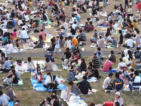 橋の上からいずれの河川敷を見下ろしましても、人、人、人(^.-)☆
