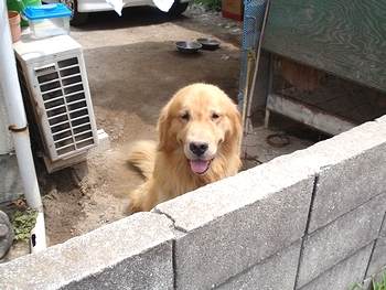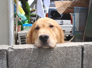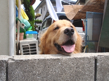 ゴンchanとノンビリと歩いていますと、突然、ガバッと低いブロック塀越しに顔を出しますこのワンchan。