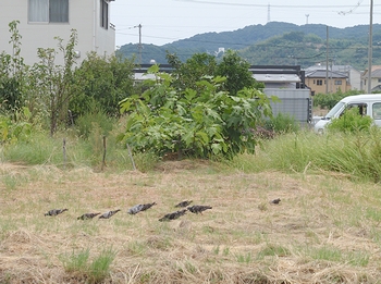 10羽ばかりで何処からかヤッて来まして、いつもこぅして一生懸命に何かを拾って食べています。