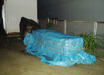 で、少し前までは土台部分にこぅして覆いをし、倒壊を防ぐ応急措置がされておりましたけど、昨夜通りました際には上の部分は取り外し井上記念館に移動されておりました。