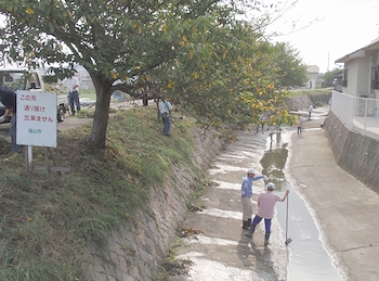 他の人が草刈り機で刈られました雑草を、後方から四つ手の鍬でかき集めては土手に上げ、これを他の方々が軽トラに積み込みです。
