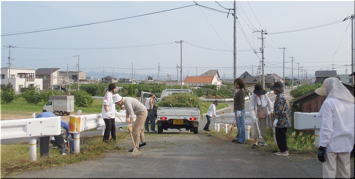 土手の生い茂りました草を草刈り機や鎌で刈り取り、これらを寄せ集め軽トラへの積み込みが分担任務。