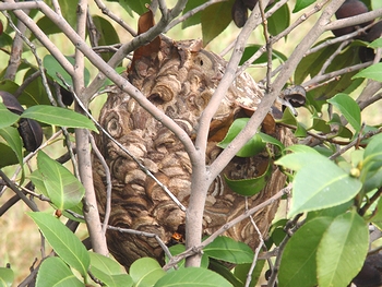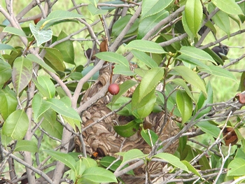 で、指さされるまま前方の樹木に眼を向けますと、なんと“大きなスズメバチの巣”ですから、たまげてしまいましたよ(^-^)