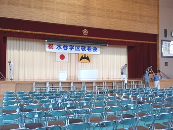 そして、ユックリと過ごすヒマもありませんで、今度は水呑小学校体育館で翌日の敬老会の準備となりました。