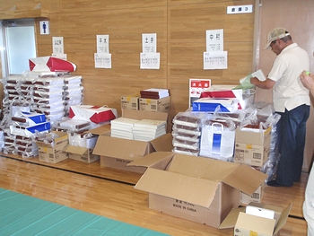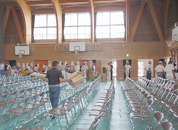 この日はこのまま、各町内会とも記念品は体育館内に置いておきまして、翌朝、体育館の外に受付を設け、ここに記念品を移動しなければなりまん。