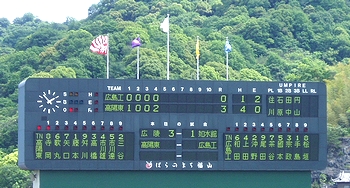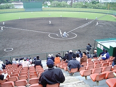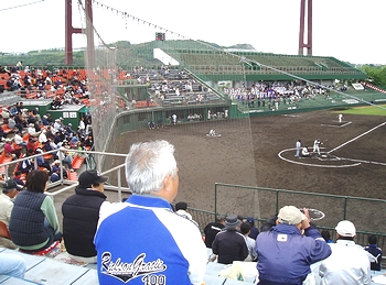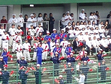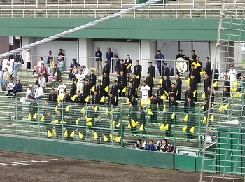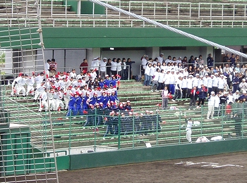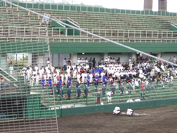 そんな所に、準決勝2試合目の高陽東の選手の皆様がドカドカッとスタンドに上がって来まして、自分たちの出番まで暫し第一試合を観戦です。