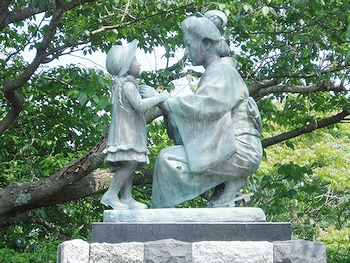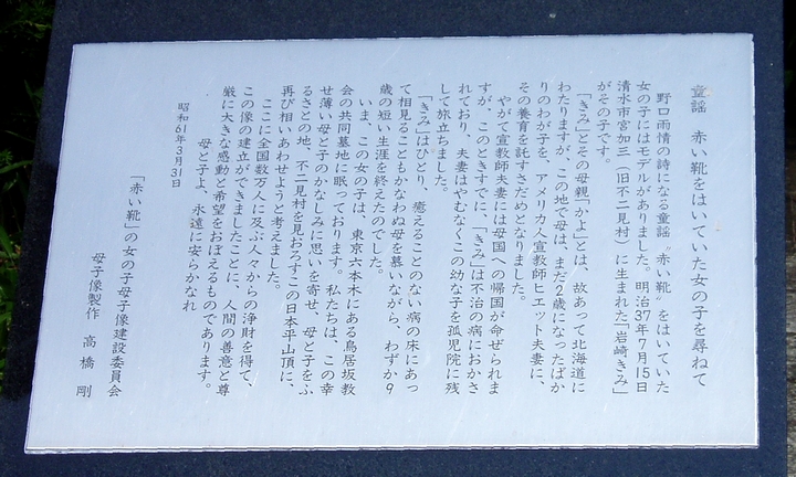 野口雨情によって歌われた童謡“『赤い靴』はいてた女の子”とその母親は旧清水市(現在:静岡市清水)の出身です。女の子の名前は岩崎きみ、母親はかよといいます。