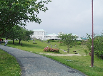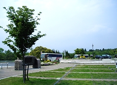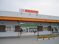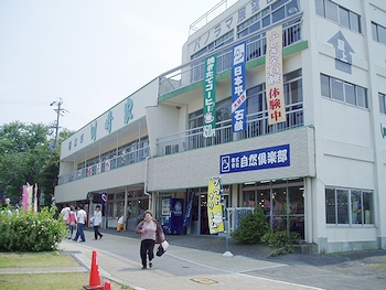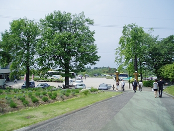 上り線と下り線が一体化された敷地内は、中央にレストラン棟、その両側にみやげ物を販売する東館と西館、奥には園地が配置された珍しい造り。