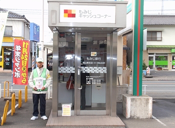 これまた昼食タイムに出かけてきますと、う〜ん、今日はATMコーナーの横に黄色の腕章を付けられました男の方が立っておられます。